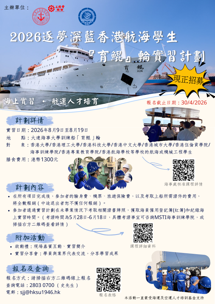 「2026逐夢深藍」香港航海學生『育鯤』輪實習計劃 正式招募! 海上實習 • 航運人才培育 夢想揚帆,邁...